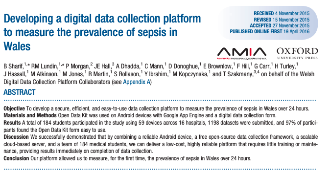 Yesterday the Journal of the American Medical Informatics Association published our first article on the development of WDDCP and its use in measuring sepsis prevalence on the general medical wards.